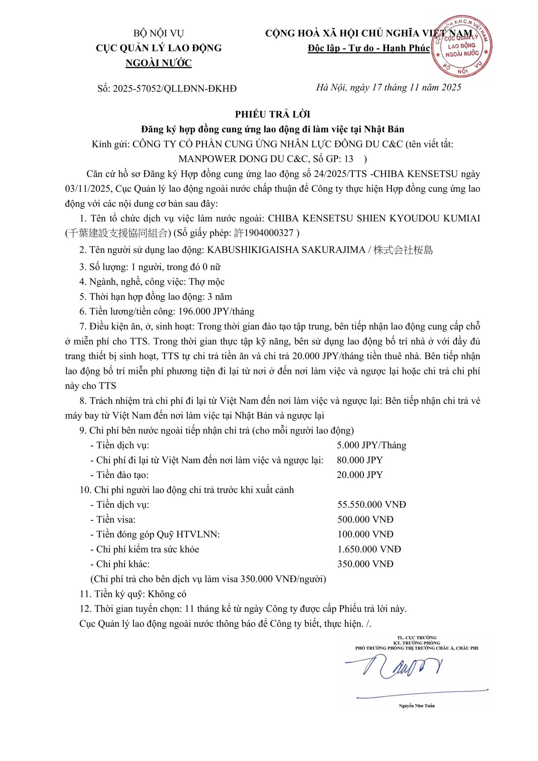 PHIẾU TRẢ LỜI – CHIBA -2025-57052/QLLĐNN-ĐKHĐ