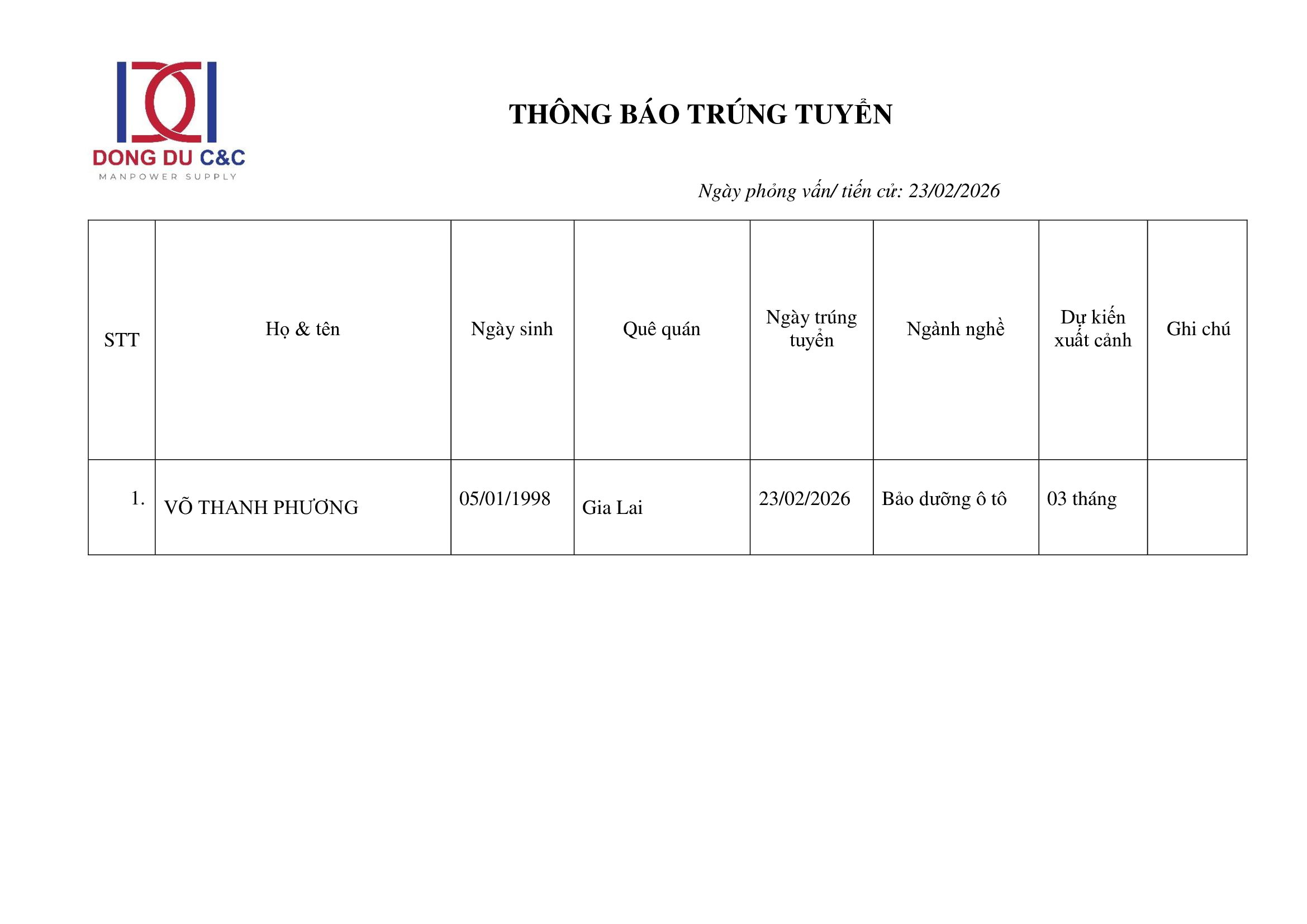 THÔNG BÁO TRÚNG TUYỂN – BẢO DƯỠNG Ô TÔ