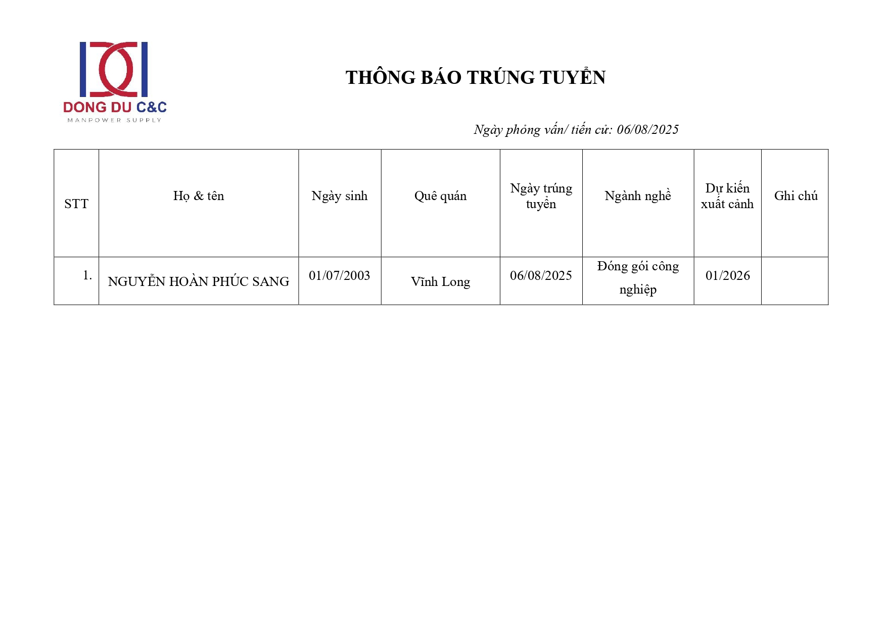 THÔNG BÁO TRÚNG TUYỂN ĐƠN HÀNG ĐÓNG GÓI CÔNG NGHIỆP