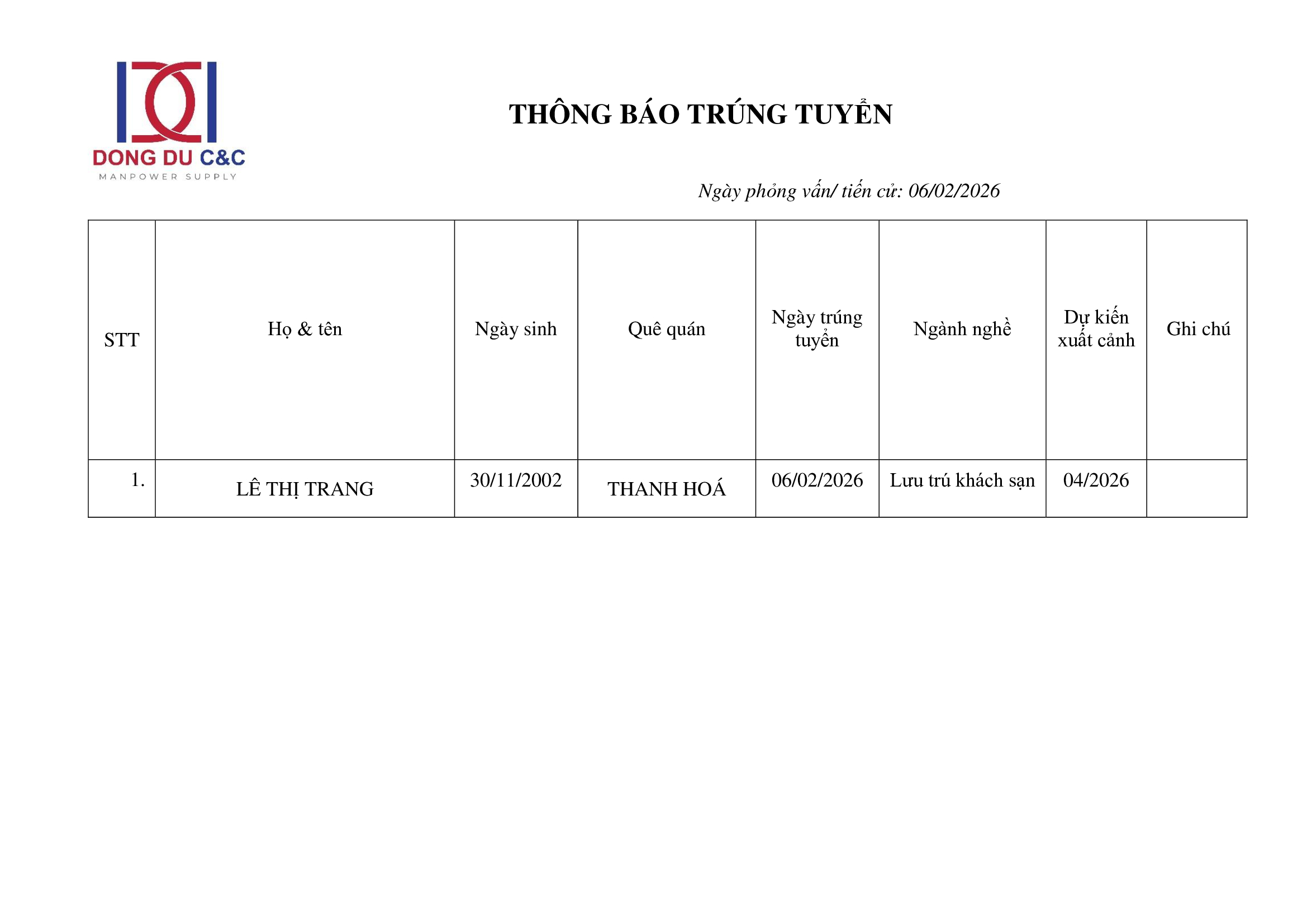THÔNG BÁO TRÚNG TUYỂN – LƯU TRÚ KHÁCH SẠN